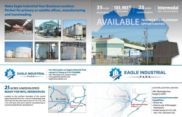 Eagle Industrial Park is in Sauget, Illinois immediately across the Mississippi River adjacent to Downtown St Louis, Missouri with easy access to major highway’s 55, 44, 64, 70, 270 and 255. The 35-acre industrial park occupies the former property of Big River Zinc Corp. For over 60 years, the zinc refinery produced 100,000 tons of zinc per year. Zinc refining operations were suspended at the plant in 2006 and was converted to a full-service trans-loading operation. Buildings on the property comprise 103,903 SF, offering a wide variety of tenant options. In addition, numerous liquid and dry bulk storage tanks are situated with rail and truck loading stations. Eagle Industrial Park offers excellent intermodal activity with rail, truck and local barge access. Onsite is 3,000 feet of rail spur, served by the Terminal and KC Southern Railroads. Over 10 of the 60-acre park are dedicated to trailer parking and outdoor storage, with a certified truck scale onsite.